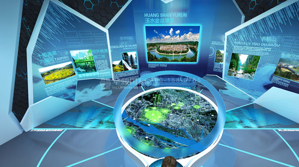 數(shù)字技術(shù): 壁掛沙盤 、 LED查詢觸控屏 、 虛擬講解 、 沉浸式弧幕影院等